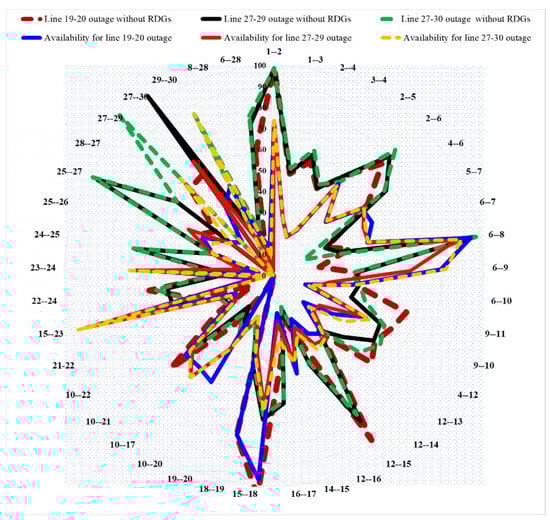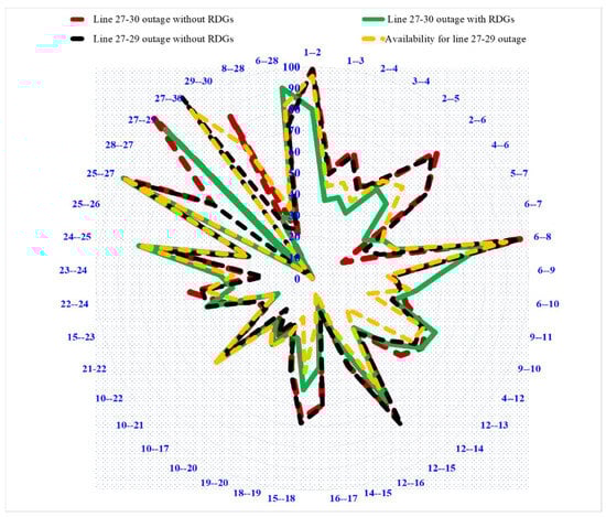 The line loading % for the IEEE 30-bus power system network with and without RDGs under line 27–30 outage.
