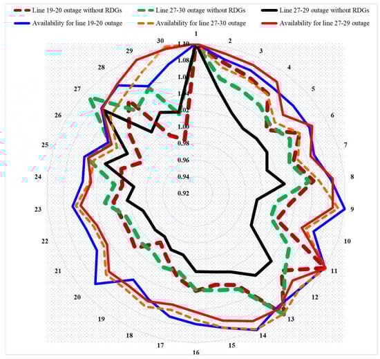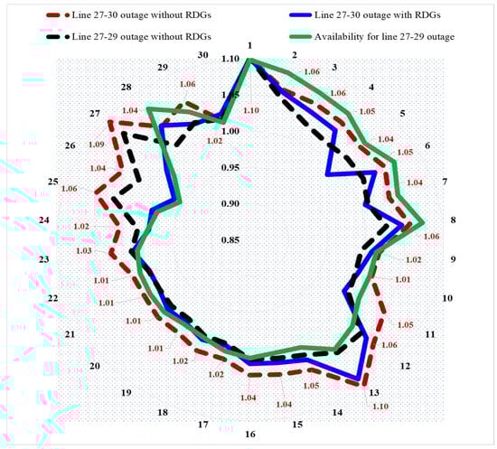 The voltage profile for the IEEE 30-bus benchmark system network under line 27–30 outage with and without three RDGs at the optimal buses 28, 29, and 30.