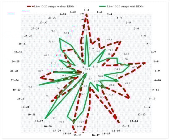 The line loading % for the IEEE 30-bus power system network with and without RDGs under line 10–20 outage.