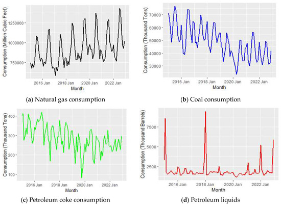 The trends observed in fuel consumption over time, depicted in Figure 1, show the dynamics of various fuel types utilized for U.S. electricity generation. Natural gas consumption (Figure 1a) exhibits a consistent upward trajectory from January 2016 to January 2022, with occasional fluctuations [7,16]. This significant increase, supported by statistical evidence [16], is attributed to several factors, including the growing preference for natural gas as a cleaner alternative, increased efficiency in gas-powered plants, and a shift towards renewables in the energy mix. In contrast, coal consumption (Figure 1b) displays a fluctuating trend with distinct periods of growth and decline, reaching a significant trough in January 2020.