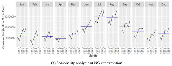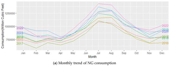 In Figure 2a, the upward trajectory of NG consumption from June to August each year reflects a consistent seasonal pattern, particularly during the summer months. This observed peak aligns with that of Figure 2b, illustrating the typical seasonal demand for electricity, which is notably driven by increased air conditioning needs in warmer weather. The surge in NG consumption during these summer periods can be attributed to its crucial role in meeting the heightened electricity demand, with natural gas power plants playing a pivotal role. This seasonality underscores the importance of natural gas in addressing the specific requirements of peak periods, providing valuable insights into its usage dynamics. The ascending trend in NG consumption from 2016 to 2022 further emphasizes its increasing significance as an energy source for electricity generation, supported by advancements in natural gas technologies, its environmental advantages, and evolving energy policies.