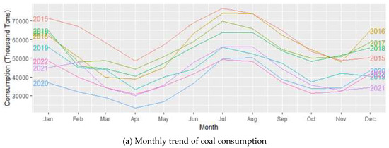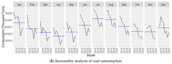 The numbers behind this trend show that there is a regular change in coal usage each month. By looking at the differences between the highest and lowest points, we can see how much seasonal changes affect coal consumption [16]. The observed cyclicality aligns with established industry knowledge on the impact of weather-related demand fluctuations on energy consumption patterns [22,23]. This seasonality analysis, presented in Figure 3a,b, contributes valuable insights for energy planners and policymakers, enabling informed decisions to address the cyclical nature of coal consumption in the context of changing climate and energy demand dynamics.