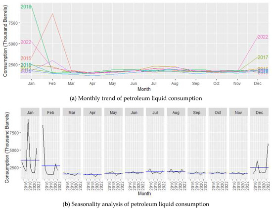 The graphical representations in Figure 5a,b offer comprehensive insights into the monthly trends and seasonality analysis of petroleum liquid consumption in the United States from 2015 to 2022. In Figure 5a, the monthly trend reveals notable fluctuations, bringing attention to abnormal spikes in February 2015, January 2018, January 2022, and December 2022. These anomalies may be attributed to various factors, such as geopolitical events influencing global oil markets, economic shifts impacting demand, or specific regulatory changes affecting petroleum consumption. Figure 5b, showing the seasonality analysis, provides a deeper understanding of recurring patterns. The observed regular fluctuations suggest that seasonal changes, economic cycles, or global events have a potential influence on petroleum liquid consumption. For instance, heightened demand during winter months or economic upturns may contribute to periodic spikes. These insights underscore the need for a nuanced understanding of the complex factors influencing petroleum liquid consumption, integrating considerations beyond mere temporal patterns. The observed data from the U.S. Energy Information Administration (EIA) provide additional context for these observations [7,22,23].