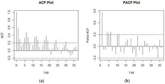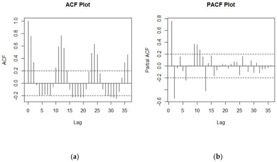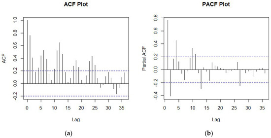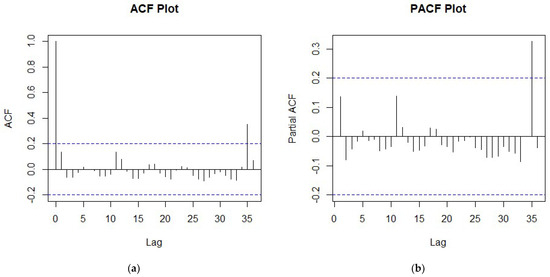 In the specific analysis focused on natural gas consumption using a lag of 36 in the ACF plot, the majority of lines are observed to cross the blue dashed line on the positive side, suggesting a significant positive autocorrelation at lag 36 (Figure 6a). The positive crossings indicate a correlation between values at a given month and those from 36 months prior, revealing a prolonged cyclicality in consumption trends. As the line (blue dashed) typically represents the 95% confidence interval for the autocorrelation values, points outside this interval may indicate significant autocorrelation. This confidence interval is essential because it helps determine whether observed autocorrelation values are statistically significant or simply due to random variation. By setting the confidence level at 95%, we establish a threshold for significance, allowing us to identify meaningful autocorrelation patterns with a high degree of confidence. In addition, in the PACF plot shown in Figure 6b, the lines crossing the blue dashed line up to lag 15 indicate statistically significant partial autocorrelations, and partial autocorrelations beyond this point are not statistically significant.