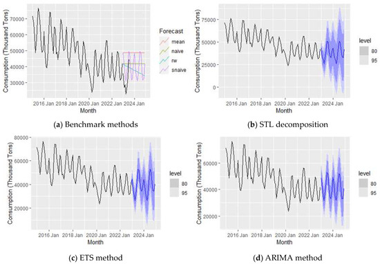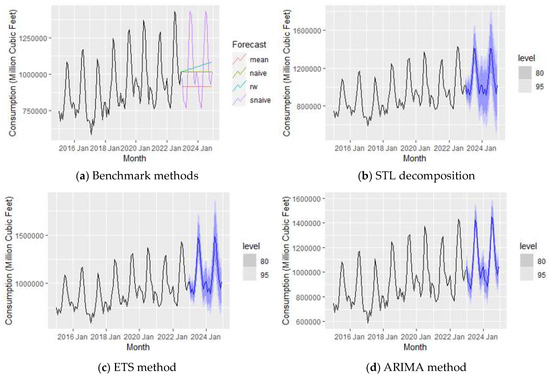 Figure 10 serves as a visual representation of the forecasted NG consumption for the years 2023 and 2024, employing diverse forecasting methodologies. The benchmark methods, STL decomposition, ETS method, and ARIMA method each contribute to a multifaceted analytical approach, offering an understanding of the varied strategies employed in forecasting. This rigorous methodology adheres to industry standards and contributes valuable insights to the realm of energy planning and policy formulation [33].