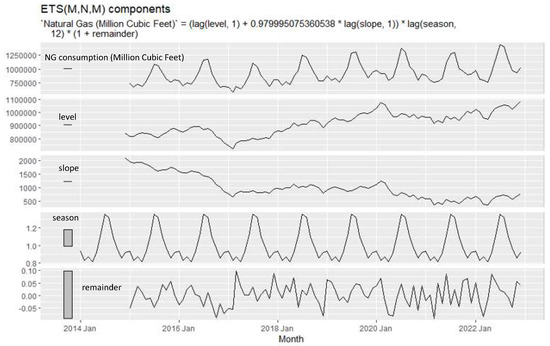 Figure 10c illustrates the forecasted natural gas (NG) consumption data using the ETS method. The ETS decomposition plot in Figure 11, derived from the ETS (M, N, M) model—signifying multiplicative error, no trend, and multiplicative seasonality—was selected based on the minimal values of AIC, AICc, and BIC, which were determined through the ETS () function in R. The estimated parameters for exponential smoothing include α = 0.583 and Υ = 0.0001, with a calculated σ2 of 0.0024. Notably, α at 0.583 denotes a moderate emphasis on recent observations in forecasting, and the lower σ2 value suggests heightened stability and predictability. These parameters assume a pivotal role in governing the rate of change for error, trend, and seasonality components, offering flexibility through α and Υ in adjusting level and trend, respectively.
