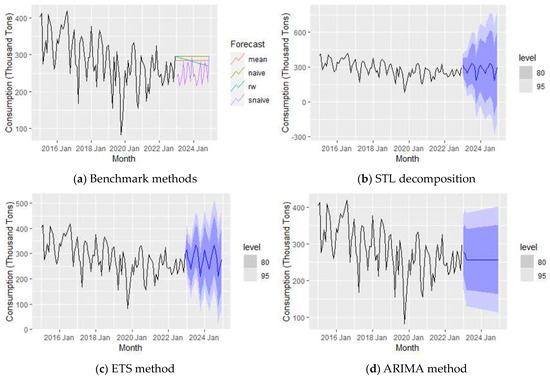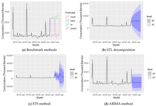The forecasting models utilized in this study were selected for their statistical robustness and based on established scientific methodologies. The Mean, Naïve, Drift, and Seasonal Naïve methods are fundamental to time series forecasting, employing the principles of classical statistical theory that leverage historical data continuity to project future values. These methods are well documented in seminal works, such as those by Box and Jenkins (1976) [37], and their simplicity and interpretability allow them to endure benchmarks in the field. The STL (Seasonal and Trend Decomposition using Loess) and ETS (Error Trend Seasonal) models are advanced techniques that extend these classical approaches to accommodate complex patterns in data. They are grounded in the research on STL by Cleveland et al. (1990) [38] and in the research on ETS by Hyndman et al. (2002) [39], reflecting the evolution of statistical learning where flexibility in model structure is critical for capturing inherent data dynamics. The ARIMA model’s inclusion is predicated on its comprehensive framework for addressing non-stationarity and is supported by extensive works in the literature on its efficacy in energy consumption forecasting (Box and Jenkins, 1976; Pankratz, 1983) [40]. By integrating these diverse methodologies, this study harnesses a spectrum of theoretical insights to provide a sophisticated analysis of fuel consumption trends for electricity production. This multiplicity of approaches not only aligns with the cross-disciplinary nature of energy forecasting but also embodies the convergence of traditional statistical techniques with contemporary analytical advancements.