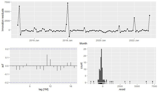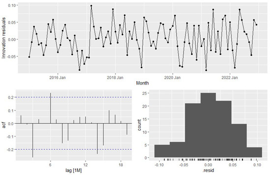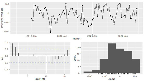 The visual analysis as in Figure 18 suggests that the ARIMA model has robustness for petroleum liquid consumption forecasting. The residuals exhibit a normal distribution in the histogram, a minimal significant autocorrelation in the ACF plot, and random fluctuation.
