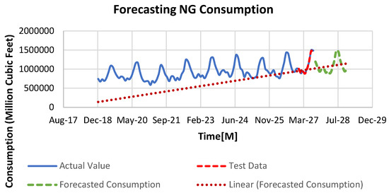 ARIMA models, encompassing autoregressive, differencing, and moving average components, offer a comprehensive framework for forecasting time series data. These models are adept at handling data with underlying trends and autocorrelations, providing a robust method for predicting future values. They combine autoregressive (AR) terms, differencing (I) to achieve stationarity, and moving average (MA) terms, making them suitable for data with trends and seasonal patterns. The pivotal parameters of the ARIMA model encompass the autoregressive component (p), which is vital for discerning correlations with antecedent values; the integrated component (d) determining the order of differencing requisite for achieving stationarity; and the moving average component (q), which is effective in accounting for correlations with prior prediction errors. The optimal values for ‘p’, ‘d’, and ‘q’ are calculated through optimization techniques, such as grid search. After training on historical data, the ARIMA model proficiently extrapolates future NG consumption values, adeptly accommodating both transient oscillations and enduring trends within the temporal dataset. This renders ARIMA an invaluable tool for precise and holistic forecasting within the realm of energy consumption [32].