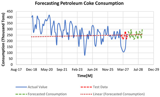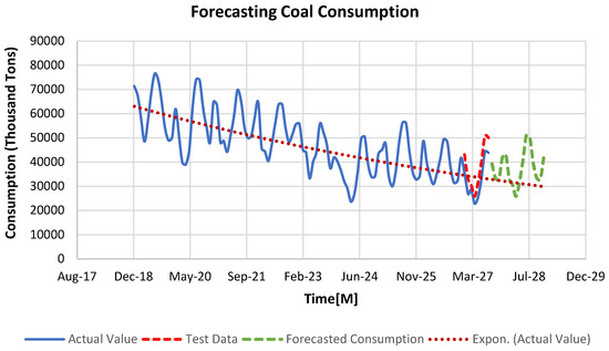 The forecast for coal consumption indicates a decreasing trend, raising questions about the underlying reasons. Analyzing the historical trend from 2015 to 2022, as shown in Figure 3, reveals a clear seasonality pattern. There is a noticeable peak in coal consumption during the summer months of July and August, followed by a gradual decline in September and October. Consumption reaches a low point in November and then starts to rise again in December. This cyclic pattern suggests that there is a seasonal influence on coal consumption, with similar patterns observed in the forecasted coal consumption (Figure 20). The decreasing trend in coal consumption can be attributed to several factors [42]. Firstly, there is a global shift towards cleaner and more sustainable energy sources, driven by environmental concerns and efforts to reduce carbon emissions. Governments and industries are increasingly adopting renewable energy sources and natural gas, which are considered more environmentally friendly alternatives to coal.