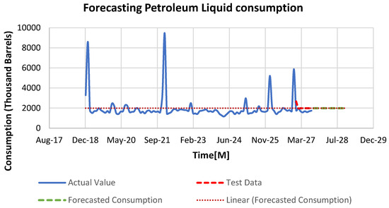 The monthly patterns and seasonality analysis of petroleum liquid consumption between 2015 and 2022 reveal spikes in February 2015, January 2018, January 2022, and December 2022. However, in the forecasted data, there are no unusual spikes. Instead, the forecast predicts consistent and steady consumption (Figure 22). This lack of anomalies in the forecast suggests that improved forecasting models have been employed. Despite historical fluctuations, recent trends suggest a normalization of consumption patterns. This stability may reflect the effective integration of petroleum liquids into specific industrial and emergency backup applications. The Department of Energy’s 2020 report highlights the critical role of petroleum liquids in ensuring grid reliability during peak demand periods, underscoring the need for diversified energy sources to maintain system resilience. These models take into account historical irregularities but anticipate a more stable trend for the future.