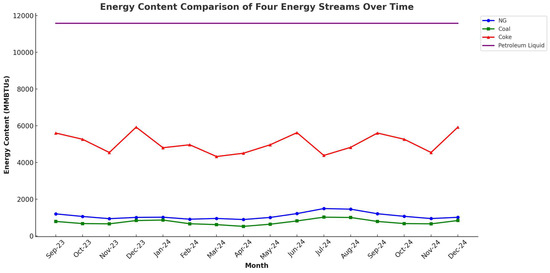 This decline aligns with a broader global trend of decreasing reliance on coal, driven by environmental concerns, regulatory shifts, and the pursuit of cleaner energy sources [17]. Notably, the drop in January 2020 coincides with the onset of the COVID-19 pandemic, which induced a temporary reduction in industrial activities and energy demand, contributing to the observed drop in coal consumption. Similarly, petroleum coke (Figure 1c) usage exhibits variability, experiencing peaks at specific times. The visible drop in January 2020, concurrent with the pandemic’s onset, can be attributed to a combination of reduced industrial activities, altered production patterns, and an overall decline in energy demand during the initial phases of the pandemic [18]. Petroleum liquids (Figure 1d) demonstrate a diverse trend with notable spikes, particularly in early 2018. This increase can be linked to a confluence of factors, including economic conditions, geopolitical events, and shifts in energy policies [19]. For instance, the spike in early 2018 may be associated with increased demand driven by economic growth and geopolitical factors affecting oil prices [20].