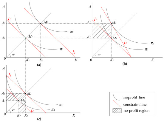 According to Figure 1a, it can be observed that in consideration of long-term input expansion, the cooperative’s budget constraint line shifts to l2, resulting in a new profit-maximizing intersection at M2. At this point, the arable land input is A2, and the industrial equipment input is K2. Due to the complementary relationship between arable land and industrial equipment, the cooperative can process all output from the arable land, leading to all profits being value-added profits.