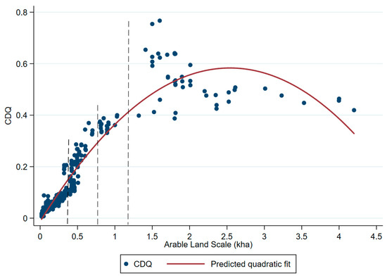 With the trend of rural arable land scale becoming the mainstream in current agricultural production, cooperatives also exhibit distinct characteristics in the variation of arable land scale. When exploring the impact of arable land scale on the high-quality development of cooperatives, it is essential not only to focus on the direct impact of arable land scale on the high-quality development of cooperatives but also to consider the possibility of diminishing marginal returns resulting from the expansion of arable land scale [49,50,51].