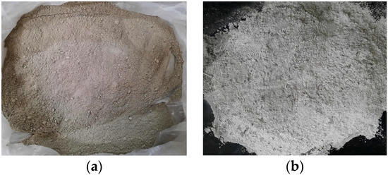 For the ESP preparation, eggshells from raw chicken eggs were used. The collected eggshells were washed thoroughly with water and were then oven-dried for 4 h at 110 °C. The dried eggshells were milled for at least 5 h using a porcelain ball mill to produce a fineness of ≤75 microns. Afterward, the ESP was subjected to pre-treatment which entailed a calcination process to remove volatile substances and purify the material. This procedure was performed by subjecting ESP to 1000 °C in a firing furnace [37]. The prepared QWF and ESP are displayed in Figure 1.