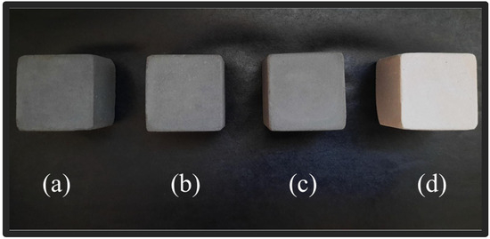 The samples in Figure 2a–c were produced using QWF, ESP, and OPC, following a Ca/Si ratio of 0.8 in the formulation [32,33,34]. The mixture proportions used to prepare the samples are displayed in Table 1. The QWF-ESP formulations were designed with increasing OPC concentrations (10, 15, and 20 percent, respectively). Based on the chemical composition results of the raw materials shown in Table 2, the precise proportions were determined by taking into account the total CaO and SiO2 and equated it to 0.8 Ca/Si. The loss on ignition (LOI) of individual materials was not yet accounted in the presented percent proportions. It was during the preparation and weighing of the batches that adjustments were made as the LOI of each raw material was considered. After weighing, water was added to the proportioned solids in a 0.70 water–solid ratio and was thoroughly mixed to form a slurry. The slurry was then poured and cast into a cubic mold (2.4 × 2.4 × 2.4 cm). After the cast mixture was hardened, it was de-molded and autoclaved at 180 °C for 6 h [25,26,35,36,37]. The control sample (Figure 2d) was formulated with the traditional raw materials, lime, and silica with only 10% OPC, while the Ca/Si ratio, water–solid ratio, and autoclaving conditions were consistent with those used for the QWF-ESP samples.