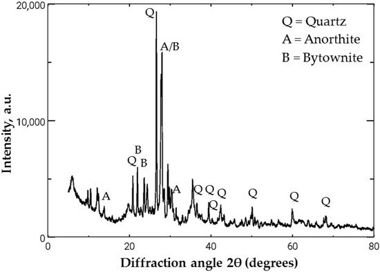 The X-ray diffraction pattern of QWF displays the major phase composition of the material including anorthite (Al2 Ca O8 Si2), bytownite (Al7.76 Ca3.44 Na0.56 O32 Si8.24), and quartz (SiO2). This implies that SiO2 in QWF occurs in different mineral forms either (1) as part of anorthite and bytownite or (2) as a crystalline form of SiO2 known as quartz. However, this material differs from sand in terms of mineral composition. Beach sand, for example, reportedly contains more than 72% SiO2 mostly in the form of quartz. In other words, QWF is composed of more diverse minerals compared to sand. Furthermore, the XRD result agrees with several published works that it is a normal characteristic for quarry fines to contain not only quartz but also other minerals, with similar characteristics to that of mine tailings [11,43,47].
