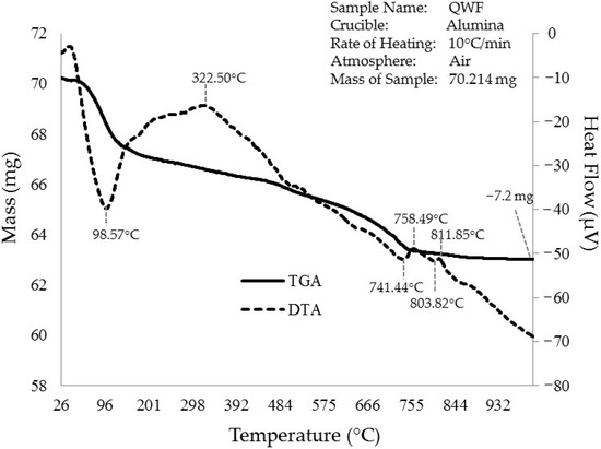 The superimposed TGA and DTA curves of QWF are presented in Figure 5. Based on the TGA data, the total mass loss of QWF is −7.2 mg which is equivalent to a 10.26% mass loss at 1000 °C. Meanwhile, the DTA curve displays an endothermic drop at 98.57 °C which is attributed to the loss of surface water and dehydroxylation. Exothermic peaks are also observed at approximately 322.5 °C, 758.49 °C, and 811.85 °C, respectively. The possible reasons for the occurrence of these peaks are the chemical and physical changes in QWF, including the removal of organic components, the decomposition of carbonates and hydroxyls, the elimination of water from the interlamellar spaces, and the formation of new mineral phases. These results have been validated by some published works on the thermal analysis conducted on some siliceous by-product-based materials, of which endothermic and exothermic peaks occur at nearly similar temperature levels [60,61]. The DTA results complement and further validate the results of the XRD analysis. Herein, based on the material’s behavior at different temperature levels, the QWF is found to have a variable mineral composition [62,63,64].