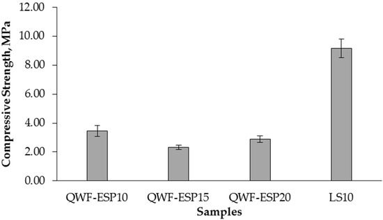 The porosity of the autoclaved product is the main determining factor of the compressive strength. Hence, to further support the physical property test results, the compressive strengths of the samples were determined (displayed in Figure 8). Herein, it can be observed that the different amounts of OPC have significant effects on the compressive strengths of QWF-ESP samples. QWF-ESP10 has a higher compressive strength than QWF-ESP15 and QWF-ESP20. This suggests that a lower amount of OPC could produce a stronger autoclaved QWF-ESP product. In addition, the QWF-ESP samples have significantly lower compressive strengths than the reference sample LS10. Yet, the QWF-ESP samples have higher bulk densities compared to LS10 (Figure 7). This could mean that QWF-ESP samples and LS10 have different pore characteristics. LS10 could have thicker pore walls than QWF-ESPs, resulting in higher strength while having a low bulk density [23,24].