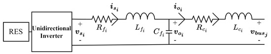 The RES configuration is shown in Figure 2. The RES model is similar to the EV charger model, except that the bidirectional inverter is replaced with a unidirectional inverter. Here, the inverter model in [45] is adopted. Like the EV charger model, the DC-side dynamics are neglected. The state equations of the RES i, connected to bus are as follows: