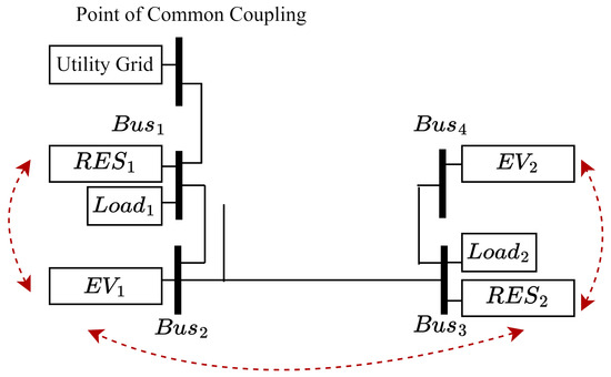 - The proposed controller was applied to the dynamic system model in Section 3. The communication time interval between each device was set to 0.1 s, i.e., the control input to EVs and RESs were updated every 0.1 s. The RLC dynamics of the distribution system were simulated.