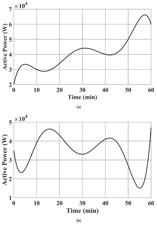 The capacities of the two EV batteries were assumed to be 60 kWh, with the initial state of energy storage being 10 kWh and 40 kWh for and , respectively. The apparent power limits of the EV chargers were set to be 20,000 VA. The upper and lower limits of the reactive power output of the EV chargers were set to 6000 Var and −6000 Var, respectively. Given that the state of charge of is low, the upper limit of the active power injection of was set to zero to avoid withdrawing energy from it. Meanwhile, its active power injection lower limit was set to −20,000 W to allow as much active power to charge it as possible. For , the upper and lower active power injection limits were set to be 20,000 W and −20,000 W, respectively.