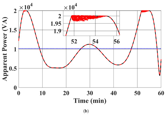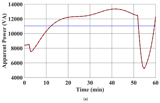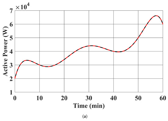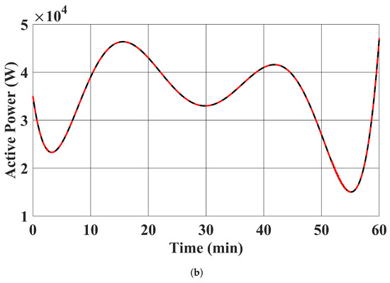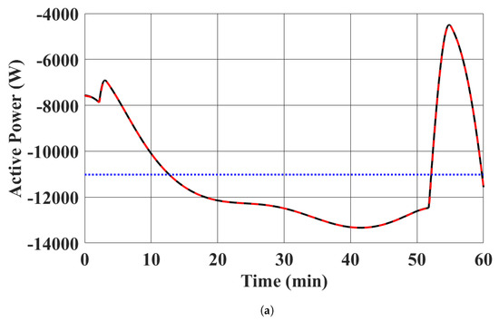 - Algebraic Equations (13b) to (13e) were solved every second, with in (13d) being set to the corresponding MPPT profiles and the active and reactive power injections of the EV chargers being set to 20,000 W and 0 Var, respectively. In this case study, the EV chargers were charged at the full rate of 20,000 W. This case study demonstrates the scenario where the charging process of EVs is uncoordinated. Again, this case study does not consider the dynamics of the system. The results are the steady state condition of the distribution system with the corresponding EV chargers’ power injections and the RESs’ power injection setpoints in each second.