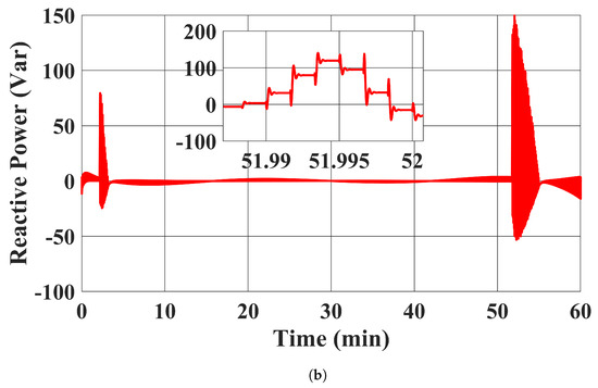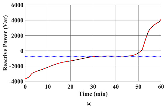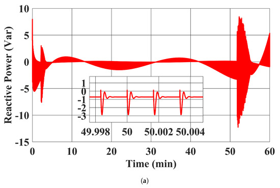 The RESs’ MPPT profiles and active power outputs using the proposed controller in case 1 are plotted in Figure 5. It can be seen that our proposed controller was able to tightly control the RESs to follow their MPPT power setpoints. Moreover, the reactive power outputs of the RESs with the proposed controller are shown in Figure 6, where their reactive power outputs were tightly regulated to zero. Note that the distortions in Figure 6 are due to the system’s transient response under the discrete time control input applied every 0.1 s.