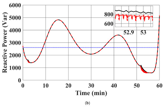 EV chargers’ reactive power injections. (a) . (Red: case 1 proposed controller was used; Black: case 2 benchmark optimal solution in (13); Blue: case 3 power injections of EV chargers were fixed to the average value in case 2). (b) . (Red: case 1 proposed controller used; Black: case 2 benchmark optimal solution in (13); Blue: case 3 power injections of EV chargers were fixed to the average value in case 2).