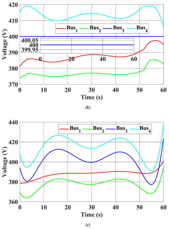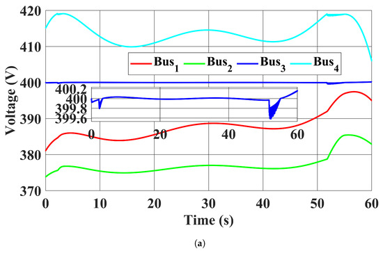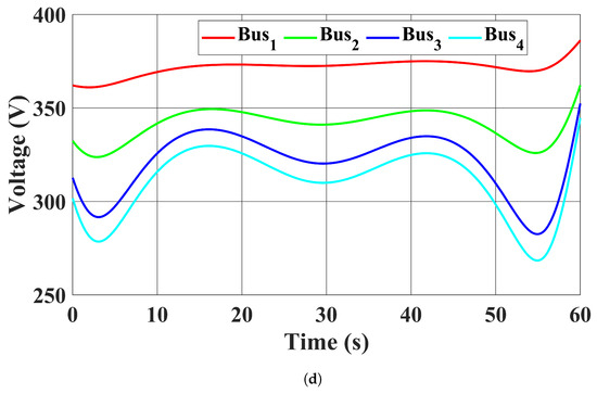 A modified four-bus distribution test system in [47] was used. Its configuration is shown in Figure 3. The standard voltage magnitude was set to 400 V, with the bus voltage magnitude limits set to 360 V to 440 V for all buses. The voltage magnitude at the point of common coupling was assumed to be 400 V, with the d axis component being 400 V and the q axis component being 0 V. For simplicity, the frequency of the utility grid was assumed to be fixed at 50 Hz. Bus 3 was selected as the CB. Four identical capacitor banks with capacitance F were installed in four buses. The MPPT profiles of and are plotted in Figure 4.