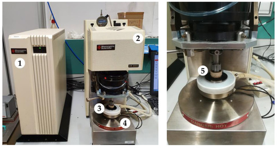 Dynamic Shear Rheometer from the PCAM-Laboratory (Physical Chemistry and Applied Materials Laboratory) of the University of Calabria. (1) Main power controller; (2) rheometer; (3) plate-to-plate geometry; (4) Peltier temperature controller system; (5) bio-binder sample.