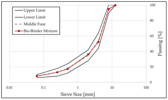 The aggregates and binders were designed in order to produce a traditional wearing course asphalt mixture for urban roads, with 8 mm of nominal maximum aggregate size, according to one of the main Italian road agency technical specifications [45]. For the mixtures, limestone aggregates were selected, and their particle size distribution is presented in Figure 3. The optimum binder content was determined through a Marshall study. Moreover, for comparative purposes, the same mixture was manufactured by using a traditional 50/70 penetration grade bitumen (B50/70).