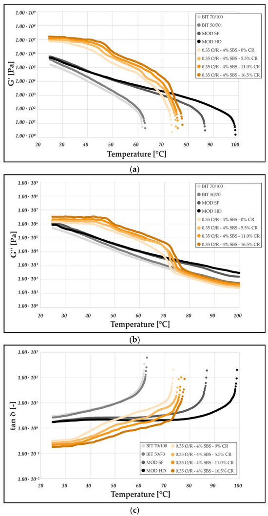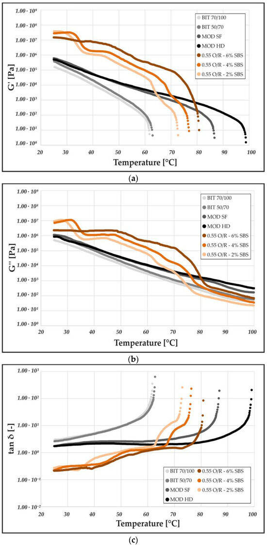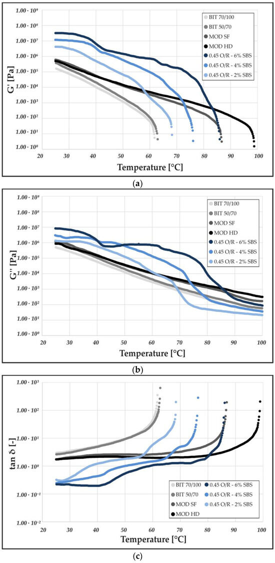 The results of the DTR tests are reported in Figure 4, Figure 5 and Figure 6. In particular, the storage modulus, G′, the loss modulus, G″, and the phase angle, tan δ, are displayed separately, and graphs are grouped according to the O/R ratio, showing the differences between different SBS content.