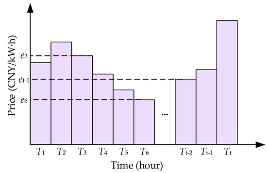 The description of the flexible job-shop scheduling problem is as follows: There are n types of workpieces that need to be machined on m machines . Each workpiece is composed of a specific sequence of operations . The operation can be processed on multiple different machines, and the machining time varies with the machine. Under the time-of-use electricity price policy, a period is divided into t periods , and the electricity price for each period is , as shown in Figure 1.