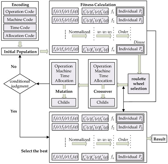 Many different approaches have been applied to solve the problem due to the difficult nature of FJSP. Some of the very recent approaches include biogeography-based optimization [31], the firefly algorithm [32], heuristics [33], invasive weed optimization [34], and differential evolution [35]. However, the genetic algorithm (GA) remains the most frequently used algorithm for the FJSP [36] and has proven to be one of the most effective evolutionary techniques for solving FJSPs [37]. Hence, considering the multi-objective nature of the GFJSP constructed in this paper, an improved genetic algorithm (IGA) has been designed to solve the model, enabling better scheduling decisions compared to empirical solutions under different weight combinations.