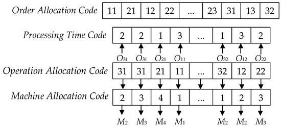 Currently, for the FJSP, a common approach involves a two-layer encoding method, comprising the machine assignment code and operation assignment code. However, this paper focuses on scenarios involving large-scale scheduling and order-based delivery. Recognizing the inadequacy of two-layer encoding in meeting the requirements of the addressed problem, a four-layer encoding method is introduced, encompassing machine assignment code, operation assignment code, time assignment code, and order assignment code. The genes of the operation assignment code correspond to operation numbers. Genes in the machine assignment code are linked to gene positions in the operation assignment code, representing machine numbers and indicating the machine selected for the operation at the respective position in the operation assignment code. To enhance the utilization of time-based pricing policies in large-scale scheduling, a modeling approach is introduced where machines batch-process one operation per hour, and scheduling is conducted based on these hourly batches. Consequently, time assignment codes are introduced to determine the quantity of batches (1 h per batch) for assigning each operation to each machine. Genes within the order assignment code represent distinct order numbers for different customers. The order number appearing in the leftmost position signifies that the order that should be fulfilled first for the respective customer, serving their needs promptly. As an example of a specific scheme, the encoding rules are illustrated in Figure 3. In this example, the order assignment code indicates the prioritization of the fulfillment of Customer 1’s Order 1, and the operation assignment code, machine assignment code, and time assignment code signify that the machine M2 processes two batches of the operation O21 (2 h) first, and so on.