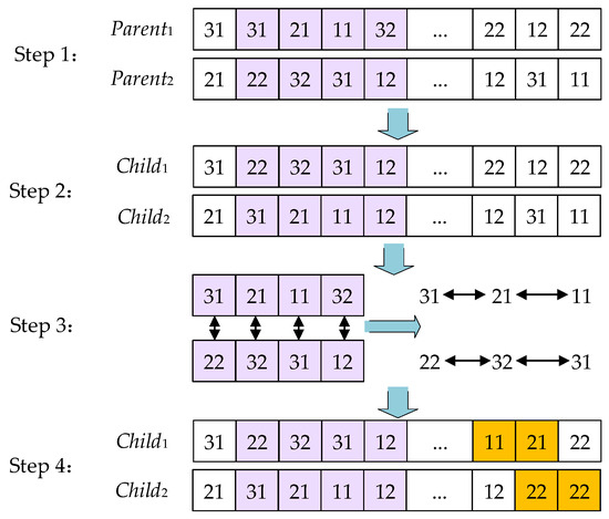 Step 4: Based on the results detected in step 3, replace one “12” gene outside the exchange region of Child1 with a “21” gene. Similarly, complete all gene replacements. The crossover steps are shown in Figure 4.