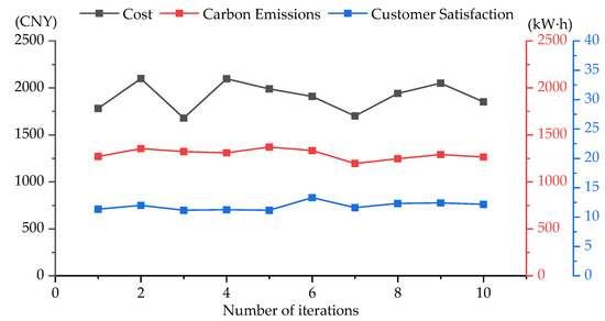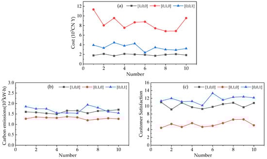 In this study, the case presented in Section 3.1 is used as the experimental subject, and IGA is employed to solve single-objective problems. The weight ratios assigned to cost, carbon emissions, and customer satisfaction are set as [1, 0, 0], [0, 1, 0], and [0, 0, 1], respectively, indicating that each solving instance only considers a single objective. The results of IGA in solving single-objective problems are illustrated in Figure 5.