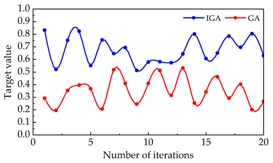 To further compare the solving effectiveness of the two algorithms, each algorithm is run 20 times, and the scheduling solutions from the 20 runs are retained. After normalization, the model’s objective values are calculated, and the results are shown in Figure 8. The performance analysis of the algorithms is presented in Table 7. From Table 7, it is observed that the IGA, when solving multi-objective problems, outperforms the traditional GA in terms of the mean, optimal, and worst values of the overall objective. The IGA exhibits stronger solution diversity, leading to a slightly higher average deviation compared to the traditional GA. Considering all indicators comprehensively, the IGA demonstrates greater advantages in solving multi-objective problems.