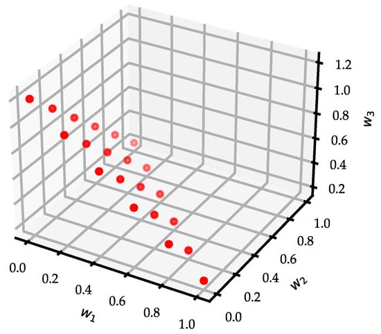 The simplex grid method is an effective tool for multi-objective analysis. Its calculations are simple, allowing for a reasonable and uniform valuation of each weight. By defining the number of grids, it can meet the precision requirements for weights. In this study, a five-order simplex grid table with a weight precision of 0.2 was selected, as illustrated in Figure 9.