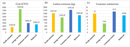 Comparison of (a) cost, (b) carbon emissions, and (c) customer satisfaction under the single objective.