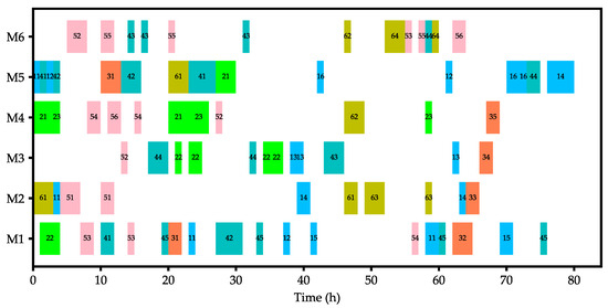 The balanced model emerges as a strategic compromise, aiming to harmonize the key objectives of cost minimization, carbon emission reduction, and customer satisfaction. This approach provides a nuanced and well-rounded solution compared to the singular objectives of the other three models. In terms of cost, the balanced model strikes a middle ground. While its cost is slightly higher than the profit-oriented model, it significantly outperforms the energy-saving model by saving approximately CNY 4863.92. This financial equilibrium positions the balanced model as a prudent choice for businesses seeking cost optimization without compromising excessively on other objectives. Carbon emissions present another pivotal dimension. The balanced model, with 1368.68 kg of emissions, achieves a delicate balance. It outperforms the energy-saving model by reducing emissions by 390.65 kg, showcasing a conscientious approach towards environmental sustainability. Simultaneously, it remains competitive when compared to the profit-oriented and customer-centric models, avoiding the excessive emissions seen in the profit-oriented model. Crucially, customer satisfaction under the balanced model experiences a remarkable improvement of 92.55% compared to the energy-saving model. This enhancement is substantial and positions the balanced model as an attractive choice for businesses aiming to enhance customer loyalty and repeat business without neglecting financial considerations and environmental responsibilities. When comparing the balanced model to the profit-oriented model, the slight increase in cost is justified by the notable improvements in both carbon emission reduction and customer satisfaction. The balanced model offers a superior alternative for businesses that seek a more holistic and sustainable approach to their operations. In contrast to the energy-saving model, the balanced model presents a more financially viable option while still making commendable strides in emission reduction and customer satisfaction. The balanced model, therefore, stands out as a pragmatic compromise, providing businesses with a versatile strategy that considers the triad of cost, environmental impact, and customer centricity. This strategic alignment positions the balanced model as a compelling choice for companies aiming to achieve comprehensive optimization across multiple objectives. Figure 11 shows the Gantt chart under this model, with the order priority allocation sequence H3J2 (the customer H3’s order for product J2), H5J2, H2J2, H2J1, H3J3, H1J1, H5J3, H1J4, H1J6, H2J5, H1J3, H4J5, H4J1, H5J6, and H4J4. Figure 12 illustrates the Gantt chart under this model, with the order priority allocation sequence H2J1, H3J2, H5J2, H2J2, H3J3, H1J4, H4J1, H1J6, H1J3, H4J5, H5J6, H1J1, H5J3, H2J5, and H4J4. Figure 13 illustrates the Gantt chart under this model, with the order priority allocation sequence H5J2, H3J2, H3J3, H2J1, H2J2, H1J4, H5J3, H1J3, H2J5, H1J6, H1J1, H4J1, H5J6, H4J5, and H4J4. Figure 14 illustrates the Gantt chart under this model, with the order priority allocation sequence H5J2, H3J2, H2J1, H1J4, H2J2, H3J3, H1J1, H5J3, H1J3, H2J5, H4J1, H5J6, H1J6, H4J5, and H4J4.