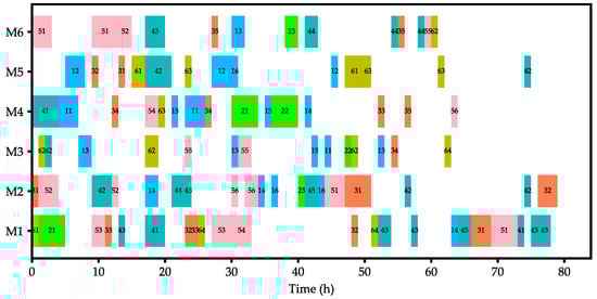 Equation (10) represents the intermediate variable , which denotes the sum of all orders submitted on the day . If the workpiece for a customer with a delivery period is supplied on the day , is set to 1, and thus the supply quantity is the sum of . Equation (11) represents the intermediate variable , which can be expressed as the residual of semi-finished workpieces from the previous time slot, plus the workpiece in the current time slot, minus the quantity produced in the current time slot for the next operation. Equation (12) indicates that when calculating the final workpiece of a workpiece’s last operation, the workpiece of the next operation in this time slot is not considered. Equation (13) states that the workpiece quantity of the next operation cannot exceed the quantity of semi-finished workpieces from the previous operation. Equation (14) specifies that at the beginning of the first day, all semi-finished workpiece quantities are zero. Equation (15) ensures that starting from the second day, at the beginning of the workpiece, all semi-finished workpiece quantities are the carryover from the previous day’s output. Workpieces completed in the last operation do not carry over. Equation (16) describes the finished workpieces at the end of each day, with the semi-finished workpieces after the completion of the last operation being treated as finished workpieces. Equation (17) denotes the inventory of finished workpieces , which is the sum of the inventory from the previous day plus today’s finished workpieces minus the quantity allocated to customers today. Equation (18) specifies that the inventory is zero at the beginning. Equation (19) ensures that supply is not possible when the workpiece is insufficient. Equation (20) represents the intermediate variable . When , indicating no orders were provided on day with a delivery period of , then . When and , indicating that orders provided on the day have a delivery period of , and thus no delay occurred, . Otherwise, the quantity of delayed orders is . Equation (21) ensures that the order cannot be delivered before the delivery date. Equation (22) stipulates that all orders must be delivered. Equation (23) states that one machine at a time can only produce one type of workpiece. Equation (24) indicates that each batch of orders can only be submitted once.