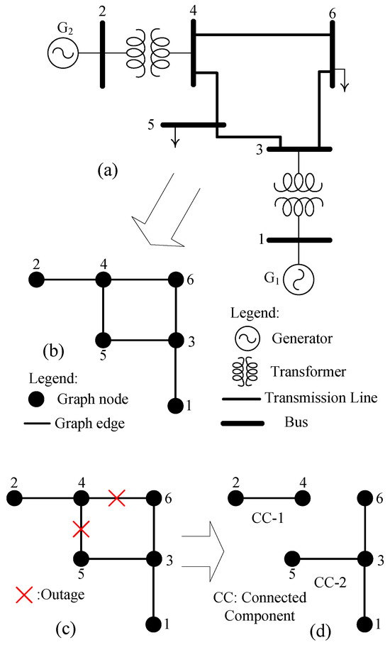 Additionally, this work utilizes the concept of connected components from graph theory. In an undirected graph, a connected component is defined as the largest set of nodes where each pair of nodes is connected by a path [23]. Essentially, within a connected component, every pair of nodes is linked by either a direct or an indirect path. Connected components are crucial for understanding the behavior and resilience of the system, as they represent distinct networks within the transmission system. By identifying and analyzing these connected components, valuable insights can be gained into the structural integrity, load distribution, and susceptibility to disruptions of the system. Figure 1d illustrates the creation of two connected components in the hypothetical transmission network following the outage of lines 4–5 and 4–6 (depicted in Figure 1c). The first connected component (CC-1) consists of nodes 2 and 4, while the second connected component (CC-2) comprises nodes 1, 3, 5, and 6.