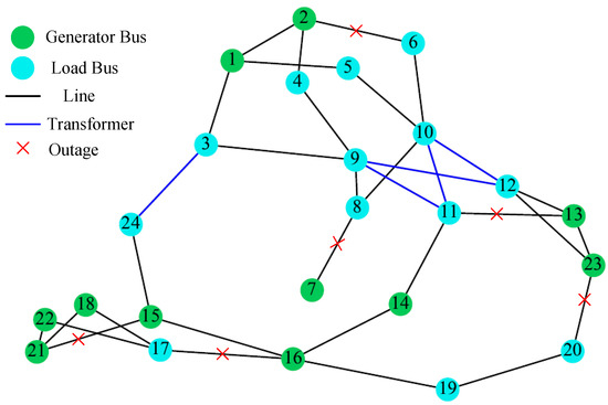 Illustrative figures play a crucial role in communicating the specifics of our case study findings. Figure 3 and Figure 4 showcase two representative outage scenarios selected from the pool of 10,000 randomly generated instances. In scenario 1, the outage affects six transmission lines: 2–6, 3–9, 7–8, 11–13, 16–17, and 20–23. Conversely, scenario 2 involves the outage of lines 2–6, 7–8, 11–13, 15–21, 16–17, and 20–23, with the only distinction being the substitution of lines 3–9 from scenario 1 with lines 15–21. Despite both scenarios featuring six line outages, only the latter, scenario 2, is classified as a HILP event. This classification is determined by the proximity index (PI), which assesses the direct connections between the outaged lines and generator buses. It is noteworthy that the PI for scenario 2 is six, surpassing the PI threshold of six, while the PI for scenario 1 is five, falling just below the PI threshold.
