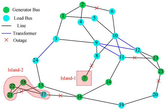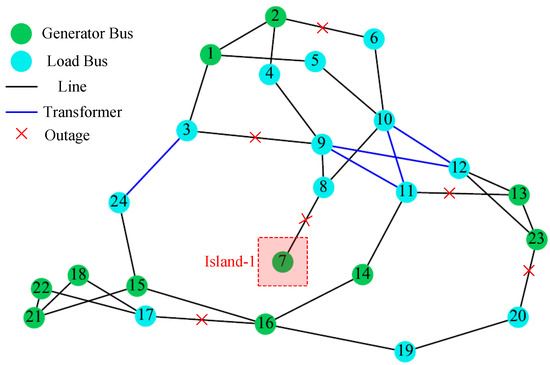 The IEEE 24-bus system is commonly utilized as a benchmark in power system analysis, consisting of 24 interconnected buses connected by transmission lines and transformers. This configuration provides a simplified yet realistic representation of an actual power system. Within this system, there are 11 generator buses (including the slack bus), 13 load buses, 5 transformers, and 29 lines (including 4 double-circuit lines treated as single lines). The detailed system data are provided in Appendix A. We construct an undirected graph, considering buses as vertices and branches (lines and transformers) as edges in the graph. This graph-theory-based approach aids in visually understanding and studying the system’s structure and connections, forming the foundation of our case studies. The Python package “pandapower” [30] is employed to conduct power flow analyses within both the primary network and isolated network segments. In this work, the DC approximation [31] to the AC power flow is considered, where bus voltage magnitudes are assumed to be unity and reactive power flow is neglected, along with other assumptions.