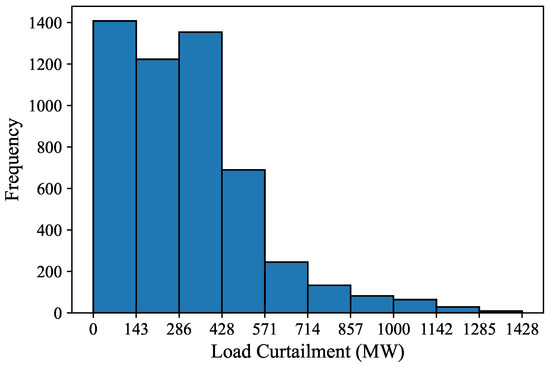 Traditional reliability-based planning methods typically focus on the average value of all events, encompassing both low-impact and high-impact events [32]. Figure 12 illustrates the distribution of load curtailment in the original 10,000 randomly generated multiple-line outage scenarios. In comparison with Figure 7, which includes only 1400 outage scenarios with load curtailment ranging from 0 to 143 MW, Figure 12 reveals that more than 5000 outage scenarios have load curtailment within the same range. This abundance of lower-impact scenarios would lead to a decreased value of ELC in the reliability-based planning approach. The ELC computed based on the original scenarios is 178.79 MW, which is lower than the ELC obtained from the HILP scenarios. This difference arises because traditional reliability-based analysis tends to average out scenarios, often overlooking high-impact events. Resilience planning, on the other hand, emphasizes a higher risk level and investment, as reflected by the higher values of ELC.
