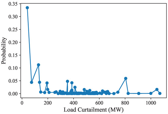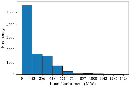 Expanding on the preceding analysis, we progress to the second stage, which involves a comprehensive examination of the system’s base case resilience. Within the pool of 10,000 randomly generated multiple-line outage scenarios, a total of 5237 scenarios were identified as HILP events. The distribution of load curtailment (LC) in the original set of HILP scenarios is visually depicted in Figure 7.
