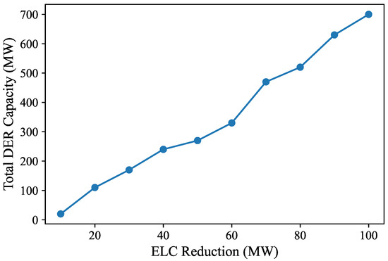 Furthermore, Figure 11 complements the tabulated results by providing a graphical representation of the correlation between ELC reduction and total DER capacity. This visual representation highlights the increase in total DER capacity as the desired ELC reduction grows. The observed trend indicates that aiming for higher levels of resilience enhancement leads to the deployment of increased DER capacities.