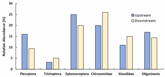 Percentage of the most abundant freshwater macroinvertebrates cumulatively collected upstream and downstream of Imhoff plants’ discharge.